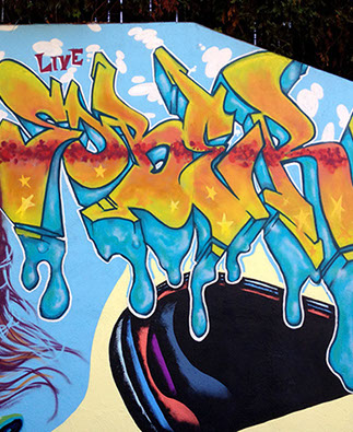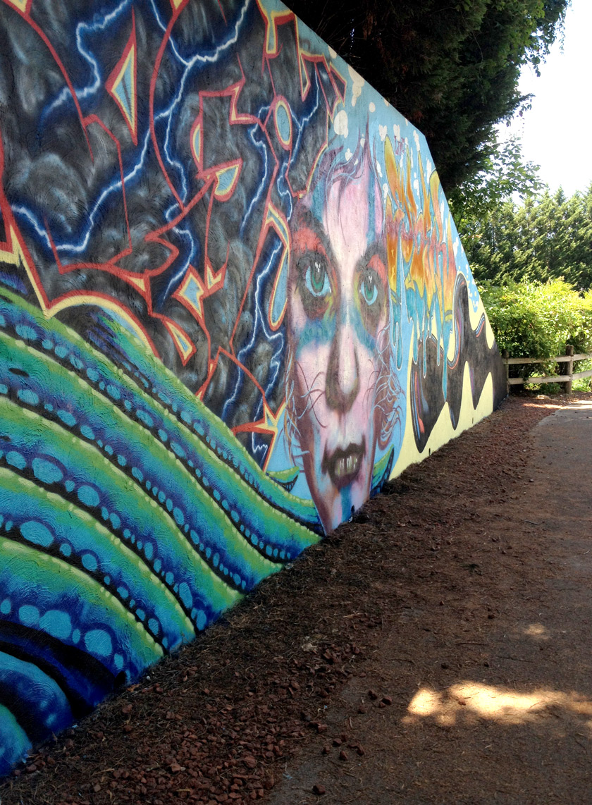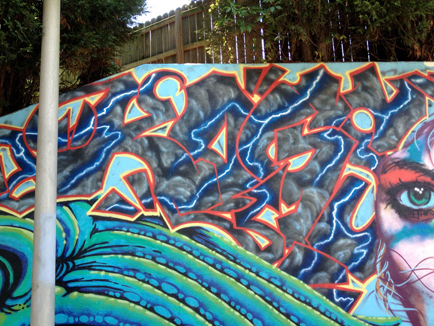 Our process began on Friday June 26th with trimming back some of the over hanging foliage then preparing and priming the face of the wall. After that each artist began work in the medium of their choice be it spray cans or traditional paint. Working side by side allowed us to discuss how each piece could interact with each others to make a more unified composition.